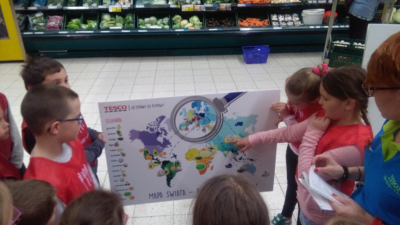 Podróż po Ekspedycji Smaków uczniowie rozpoczęli o godz.10.00. Jak wiadomo nową wiedzę uczniowie przyswajają najlepiej poprzez zabawę, dlatego też sklep Tesco na czas wycieczki stał się polem doświadczalnym i miejscem gry terenowej. Zorganizowanym przewodnikiem, czekającym z firmowym wózkiem zagadek, plansz edukacyjnych i zdrowych przekąsek okazała się pani kierownik zespołu ds.obsługi klienta. Nasz przewodnik realizował z uczniami krok po kroku scenariusz zajęć poprzez odczytywanie etykiet, śledzenie na ogromnej mapie świata – drogi przez ocean, jaką przebywają z wielu zakątków świata do naszego kraju owoce i warzyw, które uczniowie mieli okazję spróbować. Zespoły naszych uczniów brały udział w zagadkach edukacyjnych, zajęciach praktycznych i teoretycznych pod przywództwem wodzów, swoich pań wychowawczyń. Jeden z zespołów miał np.za zadanie opracować proces wytwarzania produktów mącznych od uprawy do potrawy. Inni wyszukiwali określone asortymenty na półkach, inni naklejki ukryte na hali sklepowej, które posłużyły w jednym z ostatnich etapów wyprawy do wspólnego ułożenia piramidy żywieniowej. Ten końcowy etap Ekspedycji Smaków zaprowadził nas do Bazy, która mieściła się w miejscu, w które żaden klient sieci Tesco nie może zajrzeć… Baza mieściła się w magazynie Tesco, którego powierzchnia i wyposażenie zrobiły na dzieciach szczególne wrażenie. Tam, mali eksperci zdrowego odżywiania wykonali owocowy jogurt, który był świetnym pomysłem na II śniadanie. Każdy uczestnik wyprawy otrzymał książeczkę podróżnika, a panie wychowawczynie pakiet edukacyjny z materiałami do przeprowadzania eksperymentów służących wdrażaniu w codzienne życie poprawnych nawyków żywieniowych.
